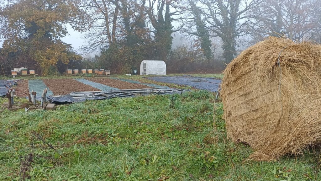 L’automne est là. Déjà bien avancé. Les boutures reposent en serre, les bottes de foin pour le paillage ont été livrées, les premières buttes montées pour la plantation de menthe verte et menthe poivrée. Sous les bâches, le temps et les petites bêtes ont bien travaillé pour laisser une terre meuble et aérée, facile à travailler. Le verger est prêt à accueillir ses premiers arbres fruitiers pendant que les abeilles prennent un peu de repos.